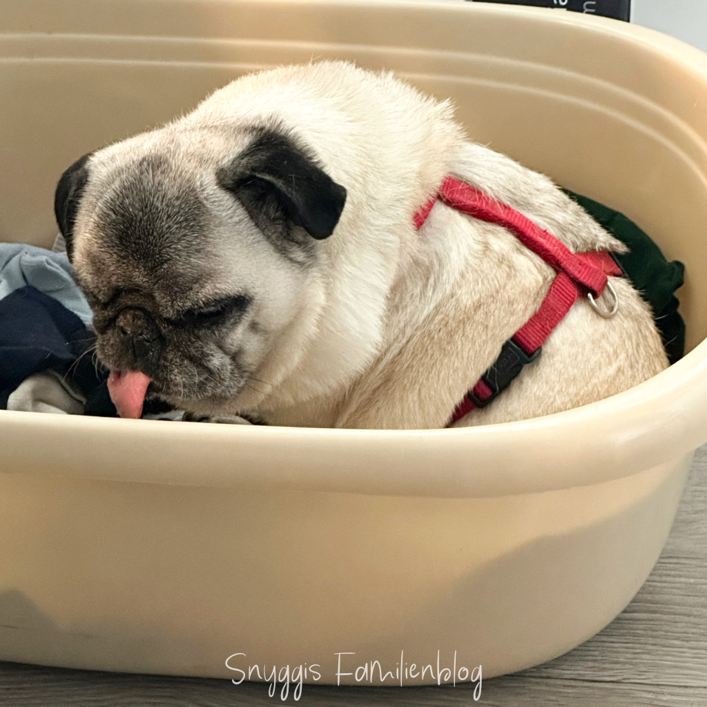 Während ich den Einkauf einräume entdecke ich Wilma – unsere kleine alte Mopsdame in der Wäschewanne bei den unsortierten Socken. Mopsgemütlich sieht es aus. Unser kleine Wilma begleitet uns schon so lange in unserem Leben. Sie wird diesen Winter 13 Jahre. Unser kleines sehr geliebtes Fellknäuel.