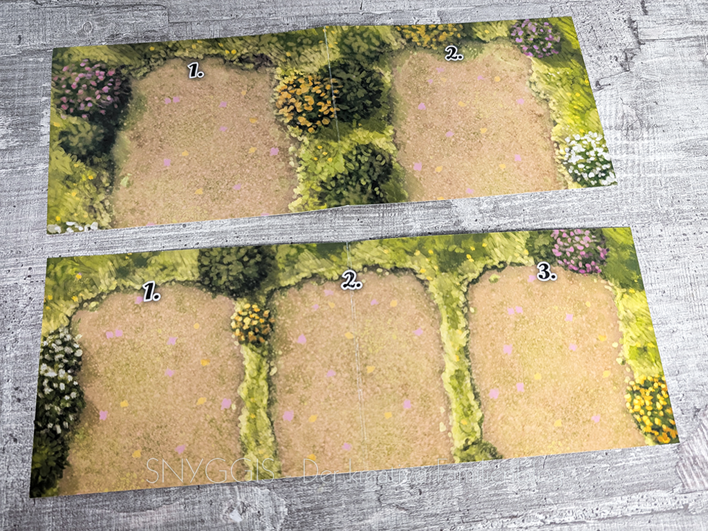 Wenn ihr zu dritt spielt, dann nehmt ihr jeder das Blumenfeld, auf dem drei Blumenfelder abgebildet sind. Wollt ihr das Spiel zu viert oder zu fünft spielen, dreht ihr die Seite des Blumenfelds um, so dass die Seite oben liegt, auf der nur zwei Blumenfelder abgebildet sind.