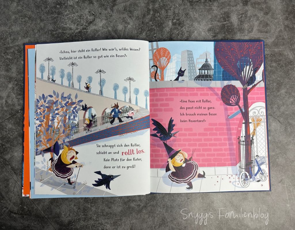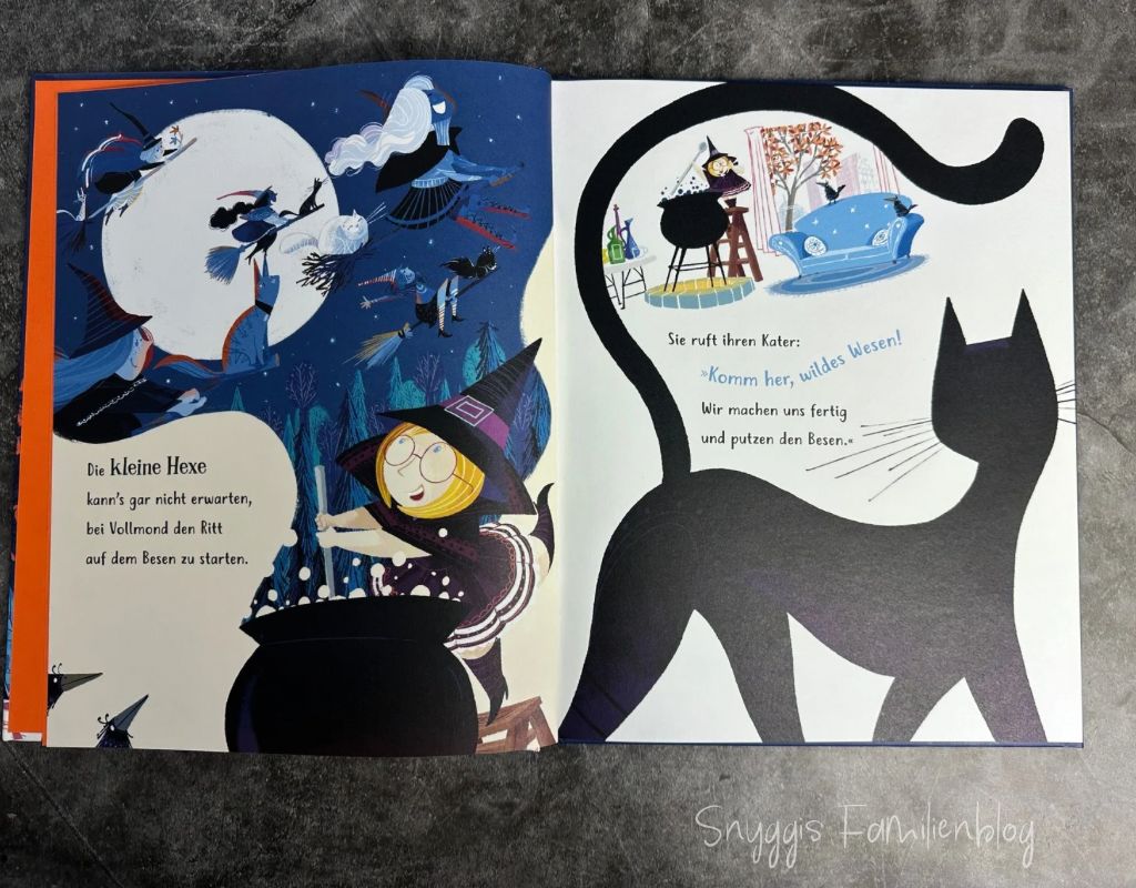 Das Bilderbuch ist ganz wunderbar und niedlich illustriert. Den Illustrationsstil von Raymond McGrath mag ich sehr und auch unser Kleiner findet die Figuren im Buch toll. Keine der Figuren sieht erschreckend gruselig aus, allesamt sind niedlich spooky. Daher isr das Kinderbuch wirklich gut geeignet für Kinder ab 3 bzw. 4 Jahren. Es ist ein sehr schönes Bilderbuch zum Vorlesen und Angucken in der Halloweenzeit. Die Geschichte wird in Reimform erzählt und besteht aus kindgerechten kurzen Sätzen. Der Clue der Geschichte ist, dass es eine Suchgeschichte ist, bei der die Kinder, denen die Geschichte vorgelesen wird, mitmachen können. Wenn man sich auf die Suche nach dem Besen auf den verschiedenen Seiten macht, findet man auch viele andere Details.