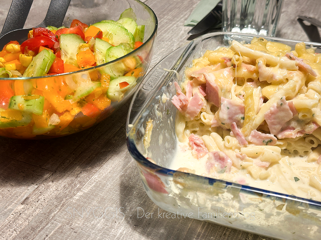 Zum Abendessen gibt es Nudelauflauf und Salat.