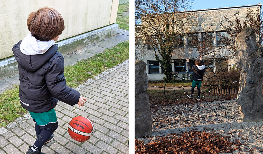 Bevor wir uns das Spiel der Mädchen gegen die Alba-Jungs anschauen gehen wir mit Quietschi noch kurz auf den Hof, Ballspielen und Klettern.