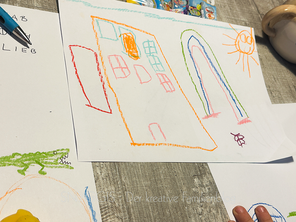 Später malen wir uns spielen dann mit den Bildern Geschichten. Hat sich Quietschi ausgedacht. Seine kleine Squishy Katze hat ein schönes Haus und jagt die Enten fort. Ich male den Enten einen kleinen Teich und ein Krokodil passt auf, dass die Katze sie nicht frisst. Mini-Snyggis malt das Meer und einen Strand und dort machen alle gemeinsam einen schönen Urlaub . Ich fand diese spontan entstandene Spielidee wirklich sehr schön.