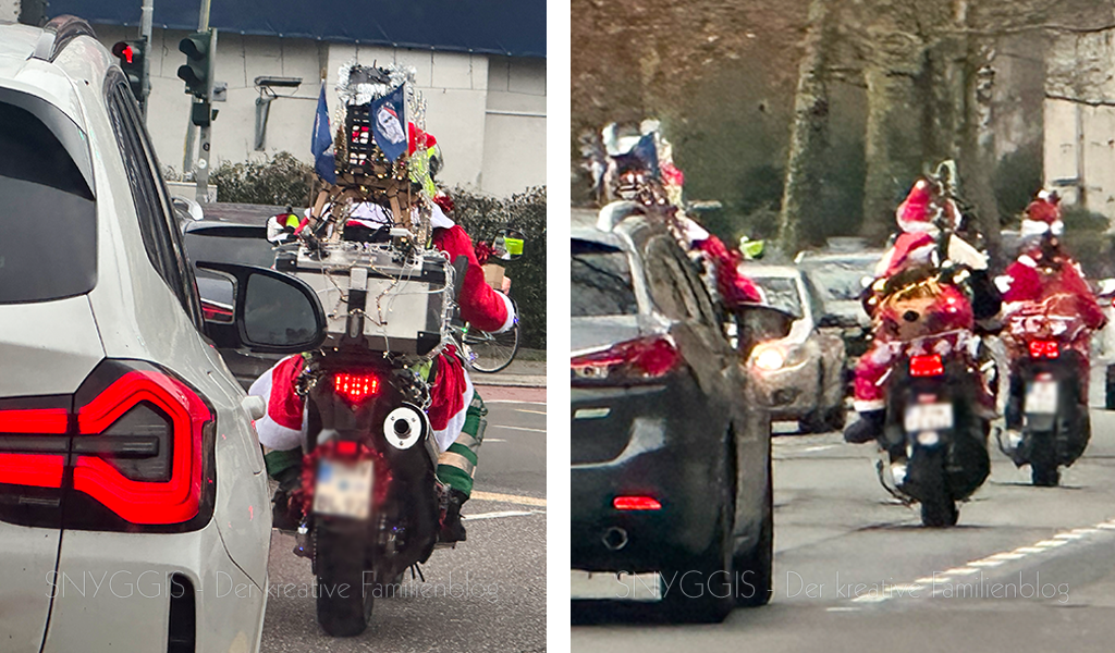 Auf der Fahrt zur Sporthalle fährt auf einmal ein Weihnachtsmann auf einem Motorrad an uns vorbei. Eine Ecke weiter gesellen sich zu ihm zwei weitere Motoradweihnachtsmänner.