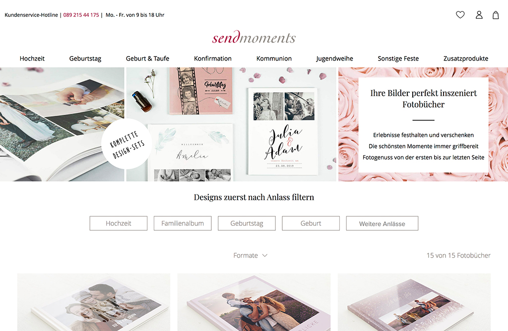 sendmoments bietet eine riesige Produktpalette für jeden Anlass an. Beispielsweise für die Hochzeit, den Geburtstag oder die Taufe etc.: Einladungskarten, Tischkarten, Menükarten, Danksagungskarten aber halt auch Fotobücher, Fotoposter, Fotokalender, Fotoleinwände.