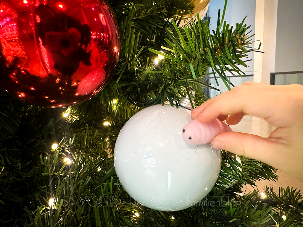 Quietschi hat seine kleine Raupe mit. Die möchte auch mal die ganzen Geschäfte sehen und den Weihnachtsschmuck dort.