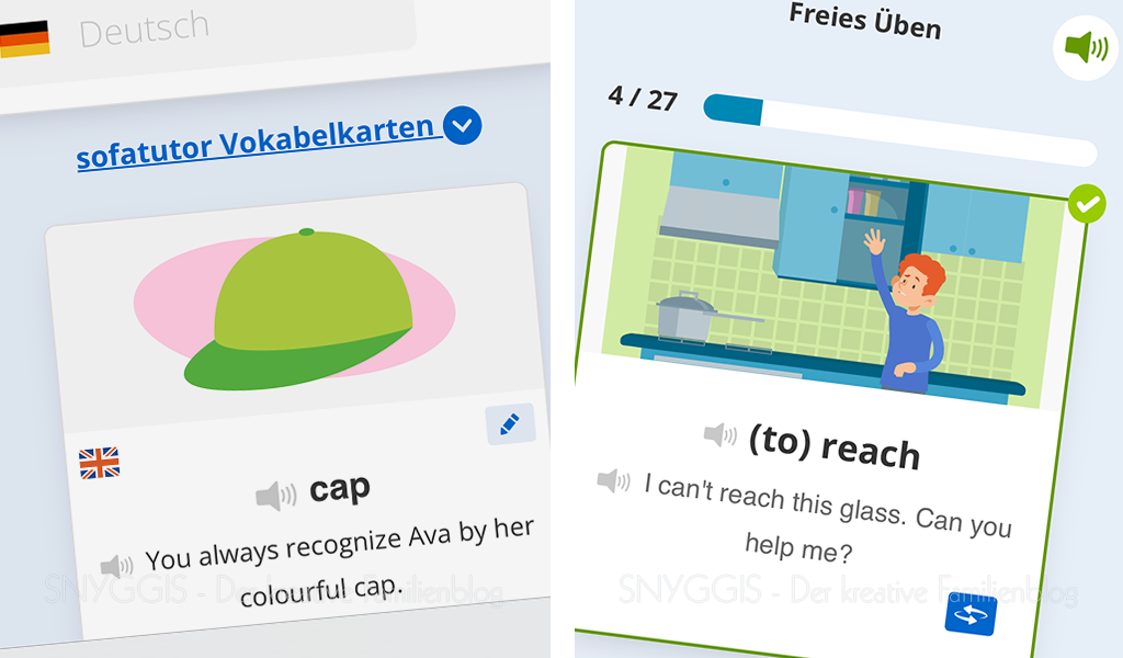 Mini- Snyggis muss heute noch ein wenig was für die Schule tun. Mathehausaufgaben fertig machen und für Englisch einen Text schreiben. Sie nutzt die Lernapp für die Schule und trägt die Englischvokabeln in den Vokabeltrainer ein. Super praktisch. Mit dem Vokabeltrainer werden die Vokabeln visualisiert und man übt Schreibweise, Aussprache und Verständnis.
