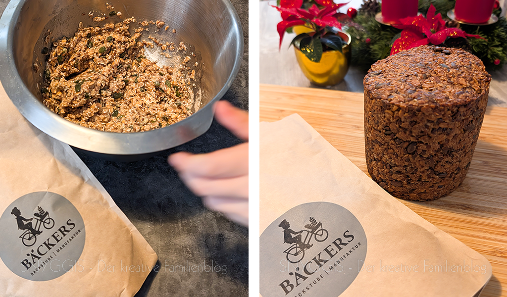 Nach dem Frühstück backen wir heute wieder ein leckeres und gesundes Brot für unser Abendbrot. Heute probieren wir das Dinkelstück von Bäckers*. Der Teig sieht schon toll aus. Richtig viele knackige Kürbiskerne und nussige Leinsamen.