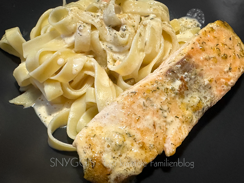 Zum Mittagessen gibt es heute leckeren Lachs und Bandnudeln.