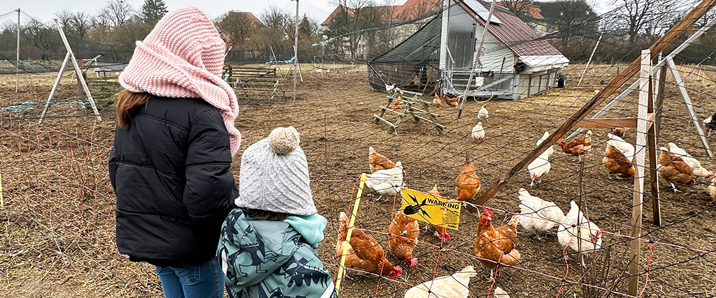 Etwas später fahren wir alle zusammen Mini-Snyggis abholen. Wir wollen noch einen kurzen Spaziergang machen und die Hühner und Kühe besuchen. Quietschi hat Hühnergold (50 Cent) in der Jackentasche für den Futterautomaten der Hühner.