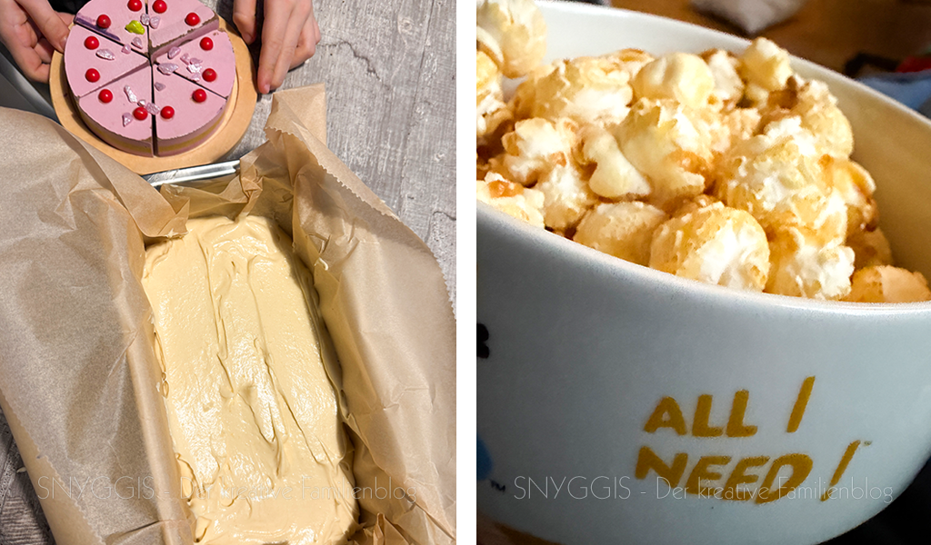 Am späten Nachmittag backen wir noch einen schnellen Kuchen für unseren Sonntagsbesuch und abends machen wir Wohnzimmerkino. Quietschi verkauft das Popcorn und die Tickets aus seiner Kinderküche. Die Kinderküche liebt er immer noch sehr.