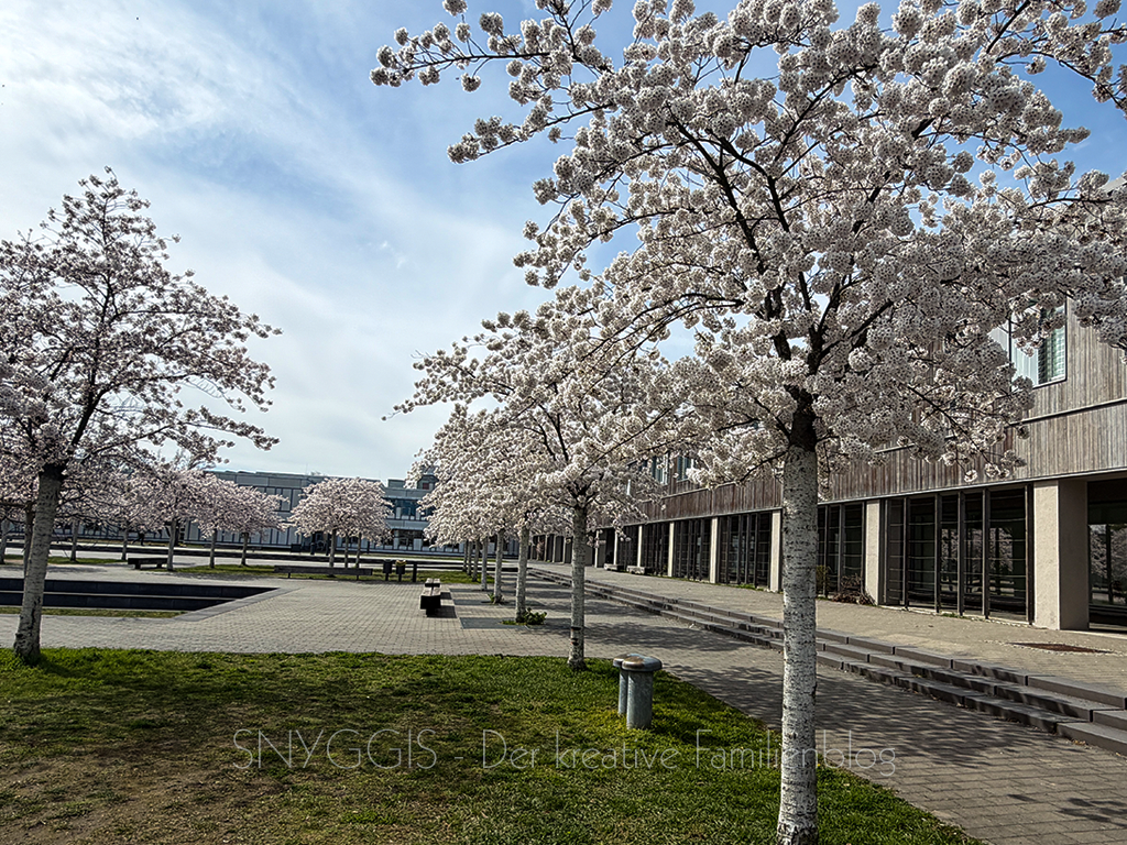 Auf dem Rückweg fahren wir noch kurz für ein Foto rechts ran als wir am Campus der Freien Universität vorbeikommen. Es blüht so wunderschön weiß.