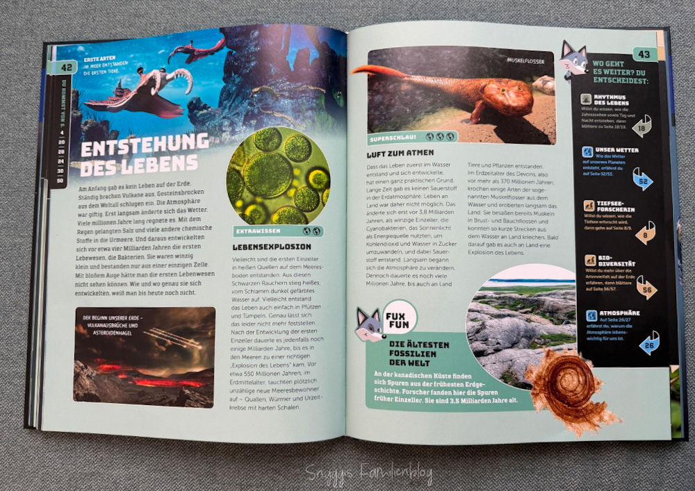 Auf den jeweiligen Seiten, findet man Icons, die auf Extrawissen, Funfacts (Fux Fun), superschlaue Sachinformationen hinweisen. Außerdem befinden sich auch Symbole an den Seiten, die einem zeigen wohin man als nächstes blättern könnte. Je nachdem welches Thema dann das Kind interessiert wählt es selbstbestimmt die nächsten Themenseiten aus. Das Buch ist quasi modulartig aufgebaut und fördert die Lesekompetenz und die Lust aufs Entdecken.