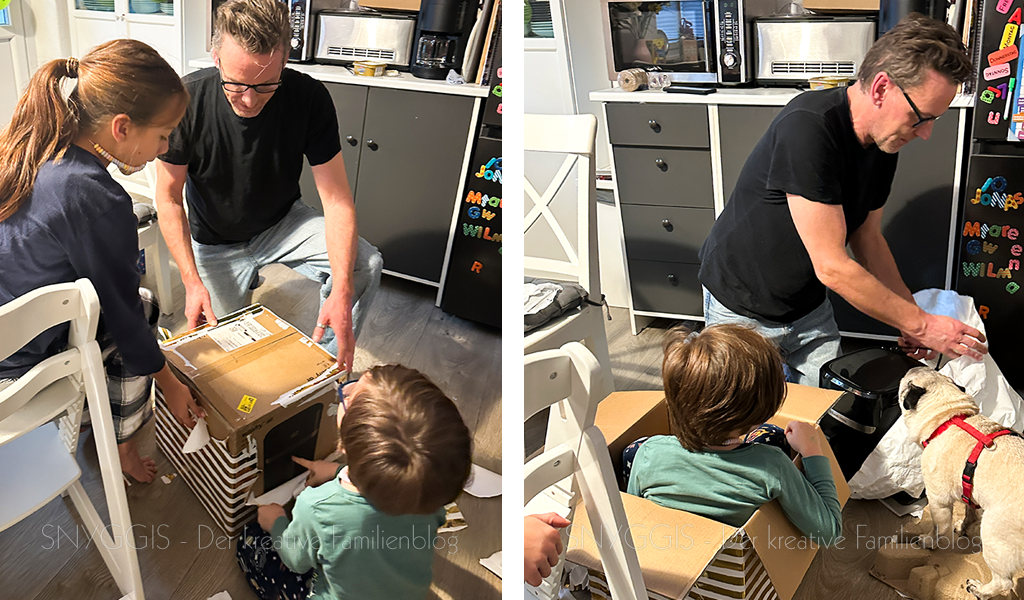 Beim Auspacken des großen Geschenks sind Quietschi und Mops Wilma natürlich zur Stelle. Wenn es große Pappkartons gibt sind die Beiden immer parat.