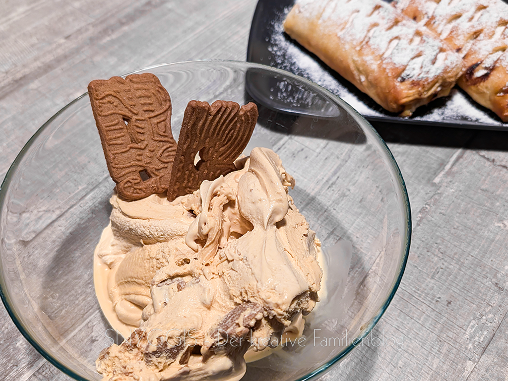 Am Nachmittag bereiten wir uns eine Eiskreation mit Spekulatius vor. Die Kinder fanden, dass wir unsere Eismaschine im Sommer viel zu selten benutzt haben. Deshalb dachte ich mir, dass wir heute Eis selber machen. Alle Zutaten zusammenrühren. Den Rest erledigt die Maschine 🙂