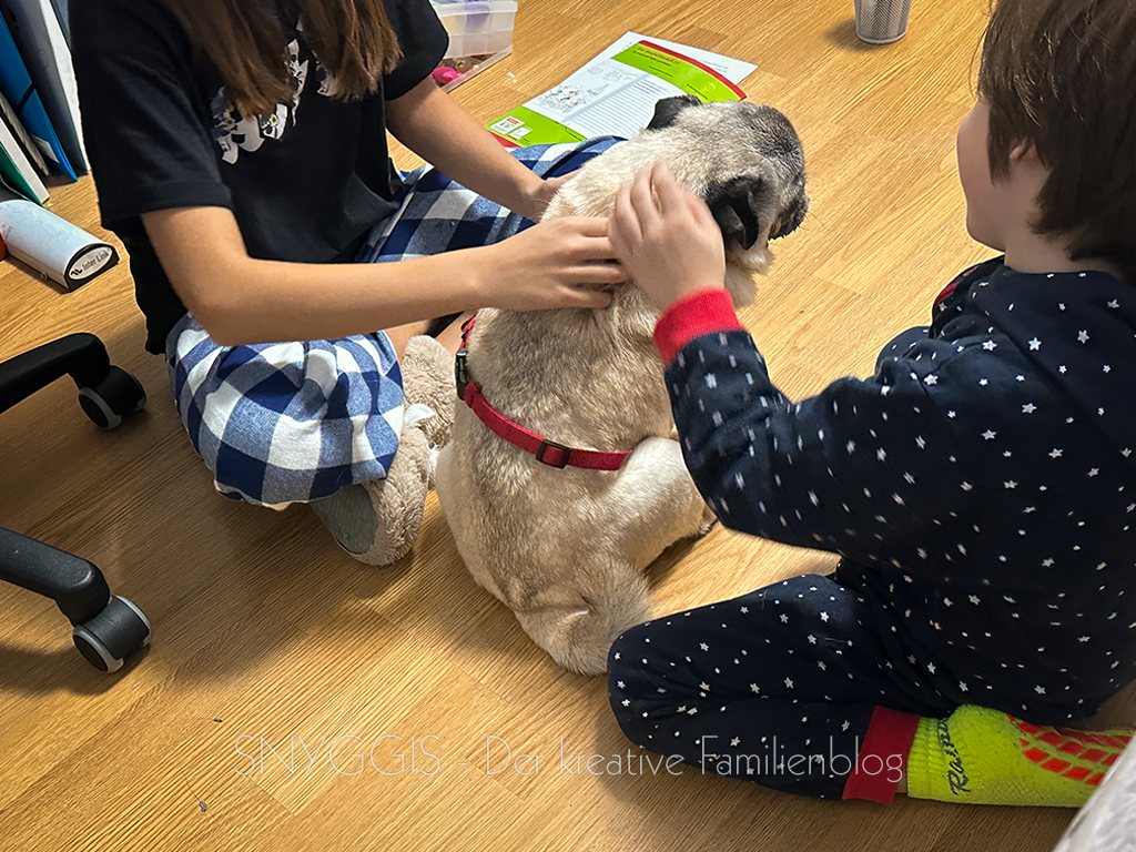 Die Kinder und das Fellkind kuscheln im Kinderzimmer. Unsere kleine Mopsdame Wilma wird in ein paar Wochen bereits 13 Jahre. Das ist für einen Hund schon ganz schön viel. Im Familien- und Bekanntenkreis sind die meisten Hunde mit 8,9,10 über den Regenbogen gegangen. Moppi war quasi das erste „Kind“ und ist seitdem ein so wundervoller Familienhund. Und ich weiß je älter Moppi wird desto näher rückt der Tag, an dem sie dann irgendwann nicht mehr bei uns sein wird. Daran mag ich noch gar nicht denken. Unsere Kinder sind von Geburt an mit ihr aufgewachsen. Wir hoffen noch auf viel Zeit mit unserem kleinen Fellfreund.