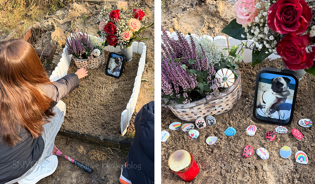 Später gehts zum Tierfriedhof zu Moppis Grab. Zu unserem Erstaunen sieht der Blumenstrauß von Wilmas Beerdigung noch echt gut aus.