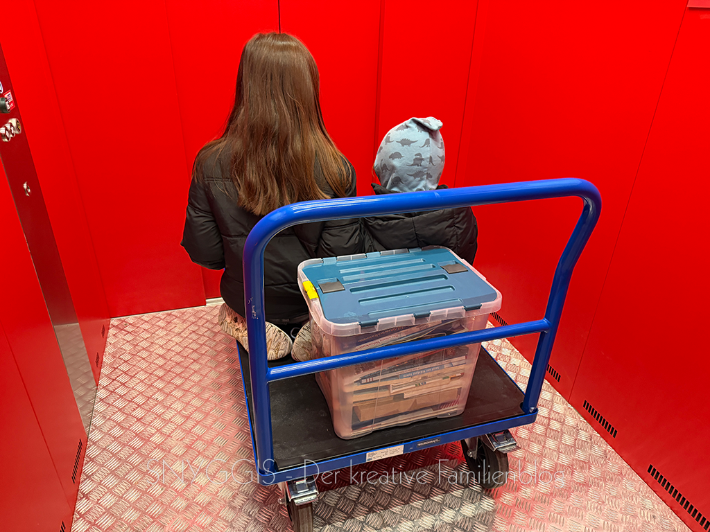 Danach geht es weiter mit Wohnung/Keller organisieren. Wir haben uns kürzlich einen ganz kleinen Lagerraum gemietet um Saisonales wie Weihnachtsdeko auszulagern. Dort fahren wir heute hin und sortieren noch Weihnachtsreste ein. Die Kinder sind heute zum ersten Mal mit dabei und sind begeistert. Am meisten Spaß haben sie mit dem Transportwagen.