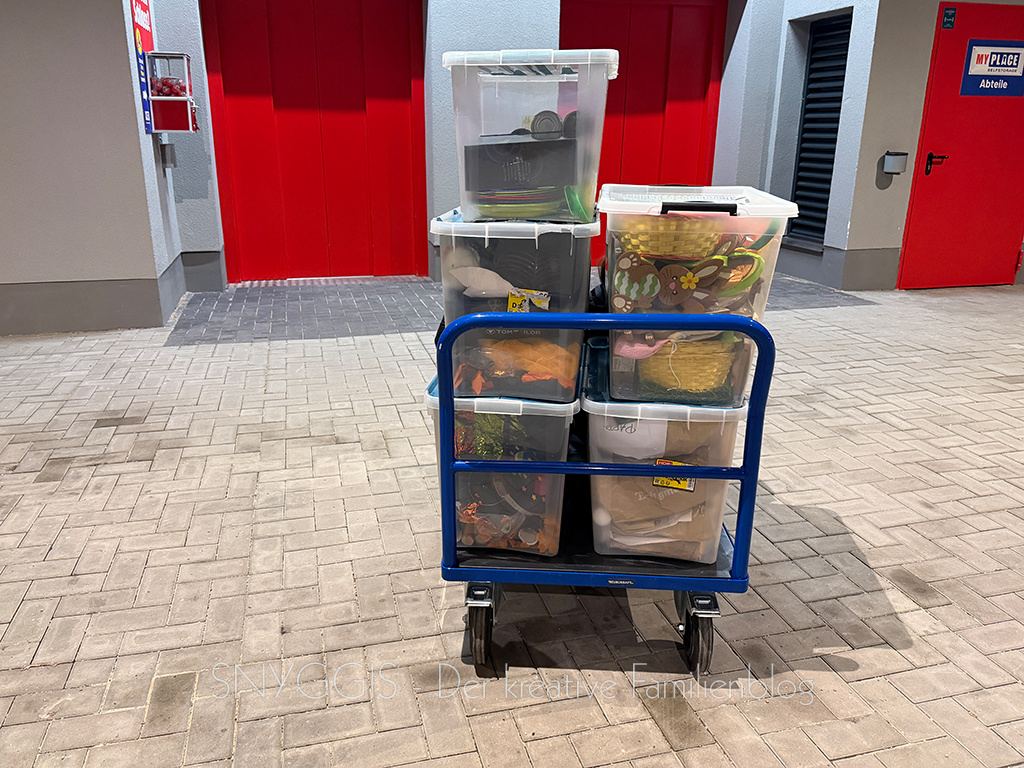 Danach fahren wir nochmals zum Lagerraum und bringen noch weitere Kisten hin. Diesmal Herbst-, Halloween und Osterdeko.