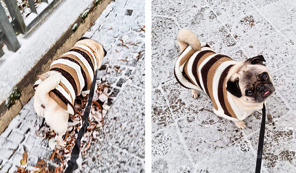 Es hat ein wenig geschneit. Unserem nun 10 Jahre alten Mops gefällts. Wilma feierte den Tag zuvkr Geburtstag.